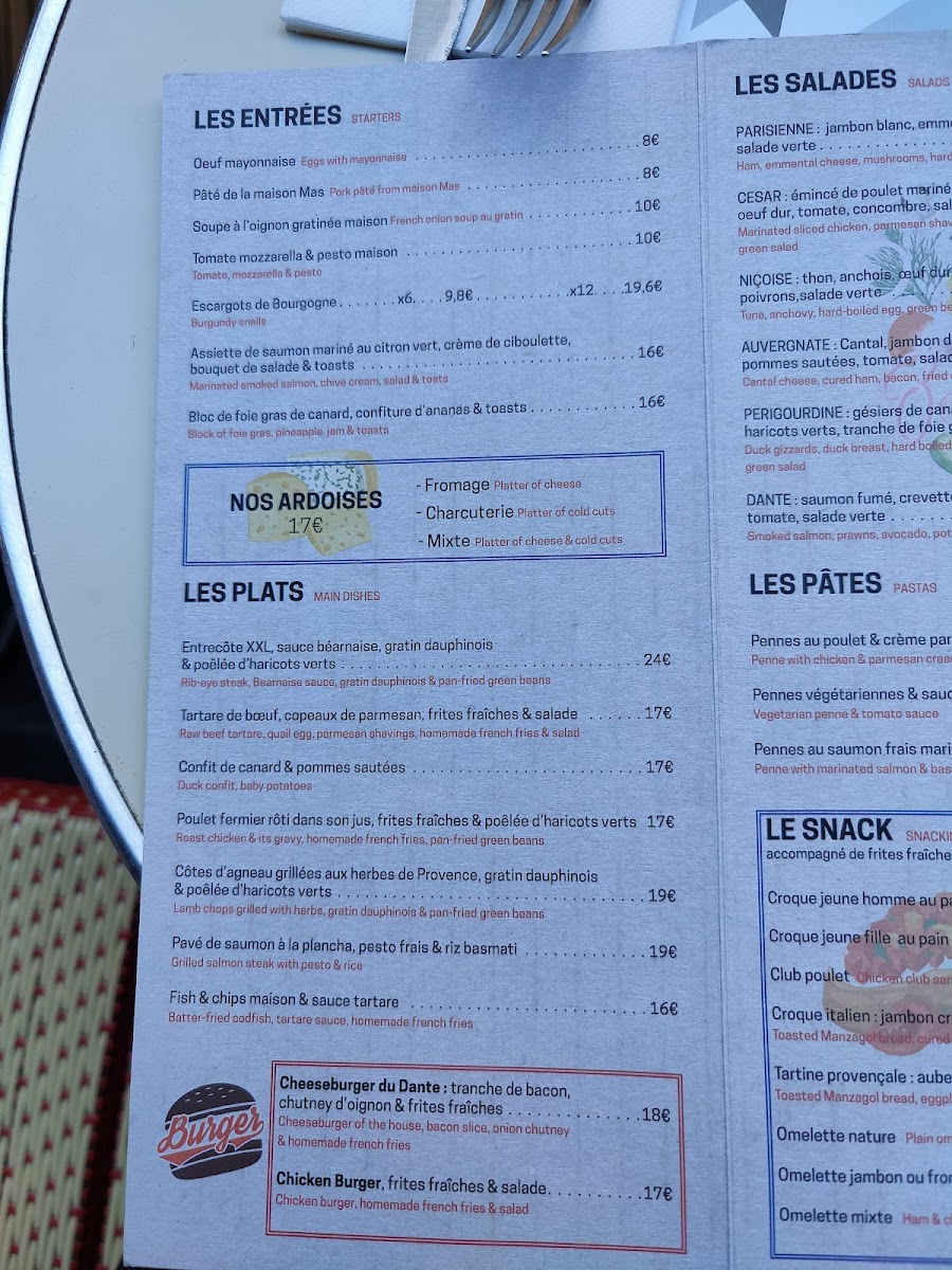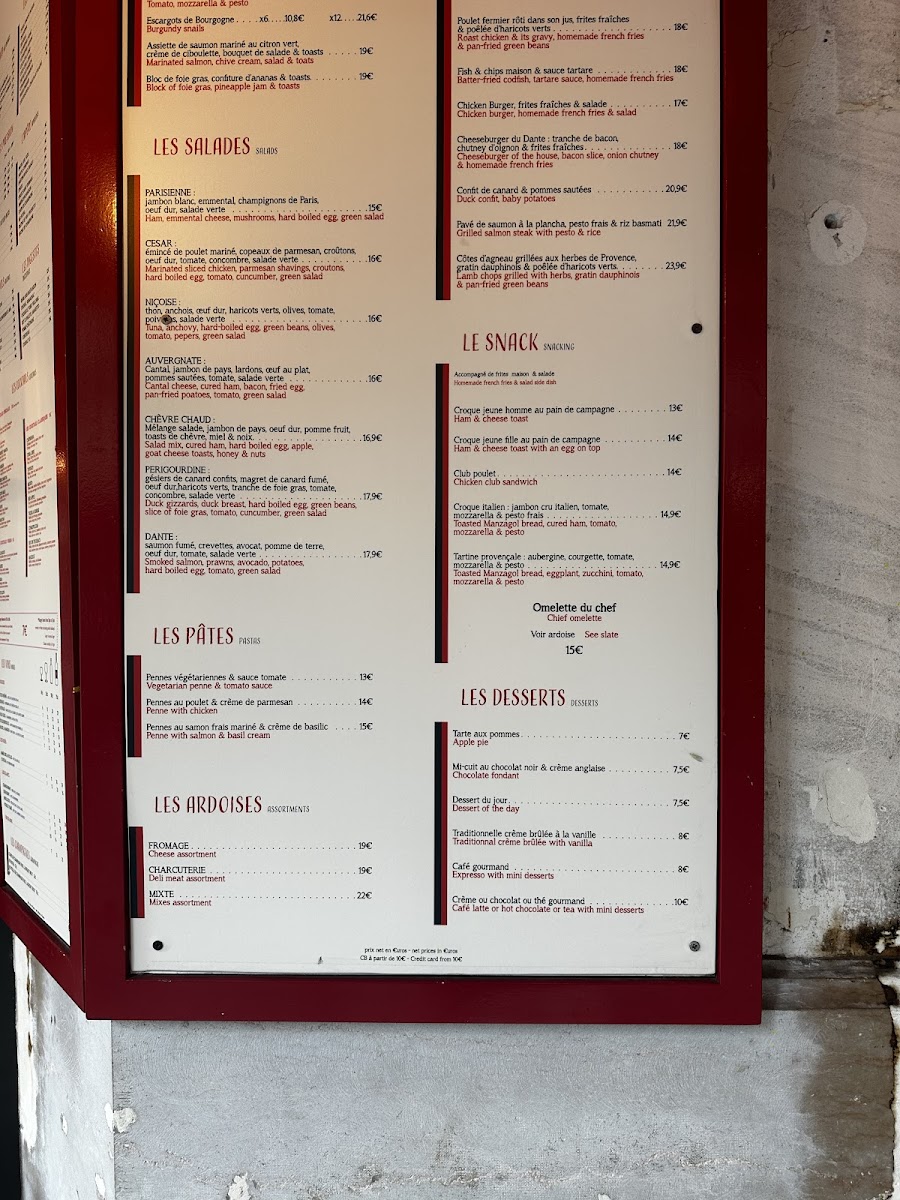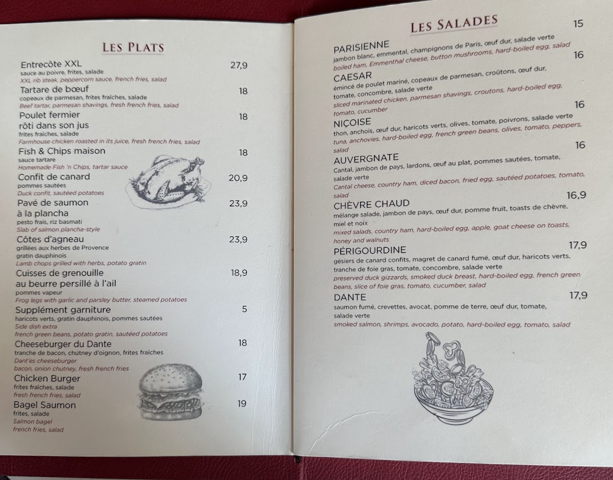Le Dante in the heart of Paris offers a vibrant brasserie experience with a menu that strikes a perfect balance between classic French flavors and fresh, inviting dishes. Highlights include the renowned Onion Soup, praised for its rich, comforting depth, and the Tomato Mozzarella & Pesto Maison, a fresh take bursting with Mediterranean zest. The chicken burger served with crisp frites and fresh salad stands out as a satisfying, well-crafted option. Desserts, made in-house, deliver a sweet end to the meal, paired beautifully with freshly squeezed juices or aromatic coffee. The food consistently impresses with freshness and flavor, while the friendly and attentive staff make the dining experience seamless and welcoming. Whether seated indoors or alfresco on the lively street side, the atmosphere remains charming and relaxed, ideal for both casual stops and leisurely meals. Le Dante truly captures the essence of Parisian dining with quality, comfort, and warmth.